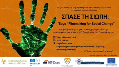 Στα πλαίσια της εκδήλωσης θα πραγματοποιηθεί προβολή σύντομων φιλμ , οπου θα προβληθει ταινία μικρού μήκους που δημιουργήθηκε σε συνεργασία του Μ.Κ.Ο. Step Up Stop Slavery με την Υποδιεύθυνση Ηλεκτρονικού Εγκλήματος της Αστυνομίας Κύπρου.
