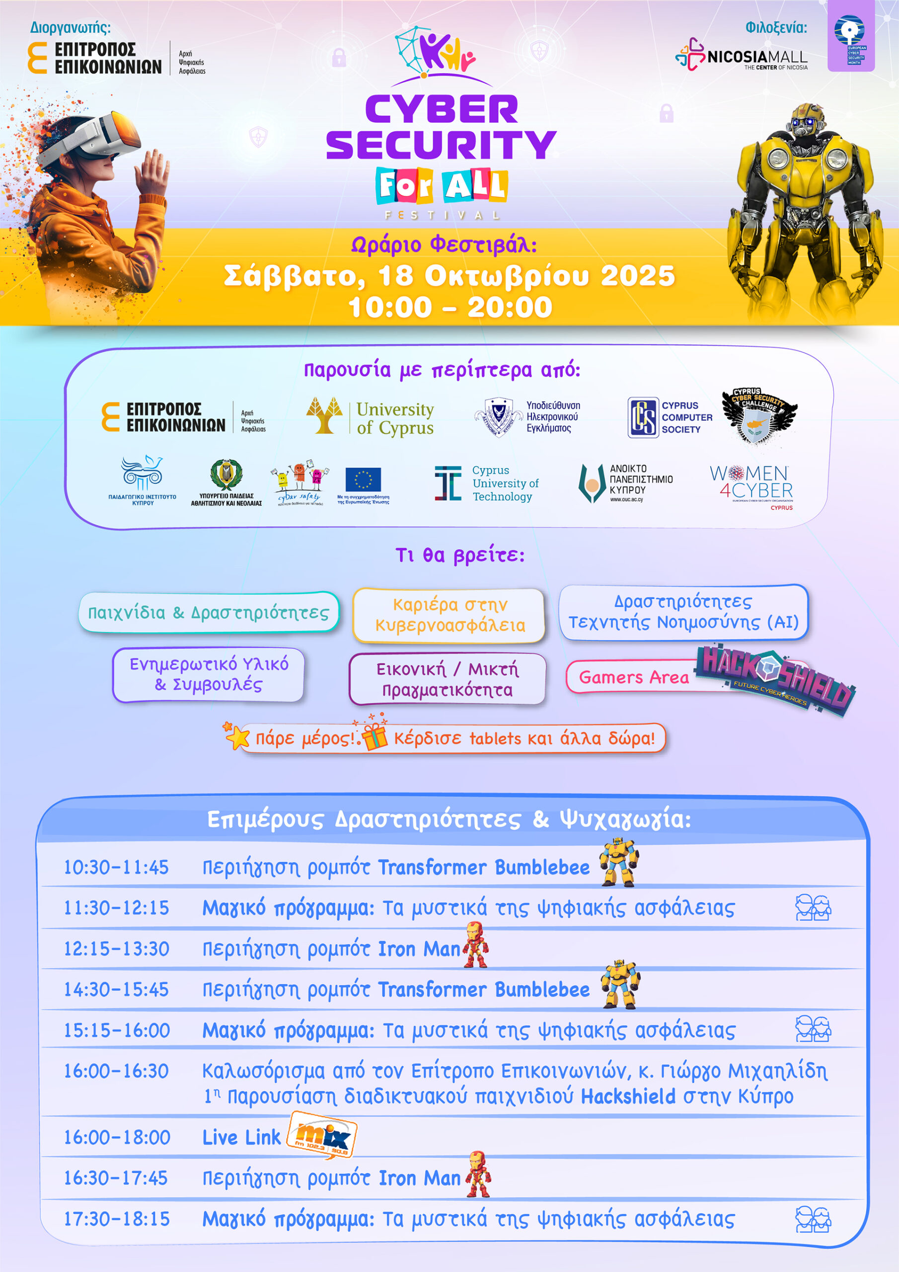 Μέλη της Υποδιεύθυνσης Ηλεκτρονικού Εγκλήματος συμμετέχουν στο «2ο Cybersecurity for ALL Festival», που πραγματοποιείται στο Nicosia Mall από 16 έως 18 Οκτωβρίου 2025.